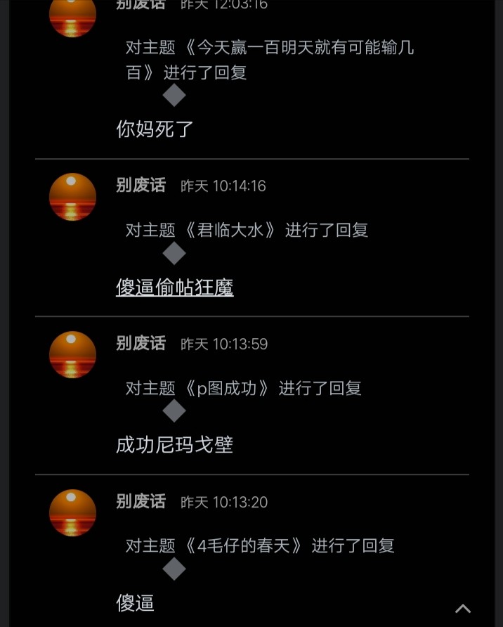 发的都是一些别人发过的东西一直重复发,还人人都有怎么不去死呢?满足跑火车说你这狗东西还不服气,不懂不要瞎逼逼人人都去曹尼玛还人人都有,你他妈脑残吧