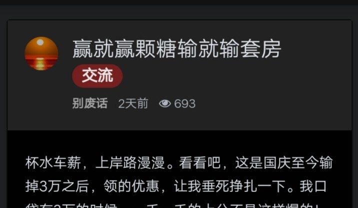 我97年的,边上班边赌,已经十年了,从2016年我上大学开始赌,今年十年了,我爸也帮我还了很多了,这十年每次都是隔一段时间就编理由要钱,陆陆续续骗的都输了,还有亲戚的。我今年是第二年没回家,我爸给我转2000块钱要我回去,我不敢,我不敢回去,我不是怕父母,我是怕亲戚,我回去要承受很大的压力,我现在也不知道怎么办,钱还没领,出来上班两年了,一分钱没存到,还花了老爸不少钱,没脸回去,小伙伴们一个个买车的买车,结婚的结婚,而我过年都没钱,但家里可不管我要不要脸,他们觉得只要我在家就不会问钱,所以他们让我回去,唉,好纠结,我在村里,亲戚眼里就是个烂人,也欠了亲戚好多钱几年了也没有还完,这些亲戚因为我的问题也不给我爸妈脸色看了,我要是拿了钱就得回去。对,我就是死要面子,我就是看不得同村小伙伴开着新买的车停我家门口,还背地嘲笑我,但我爸妈一年比一年老了,回去除非我能顶住压力,有些老哥肯定要说上分赢了回去,我不装,我确实有这个念头,赌狗嘛,哪怕我赢了,抛开这些不谈。就这种环境下我回去真的好吗
