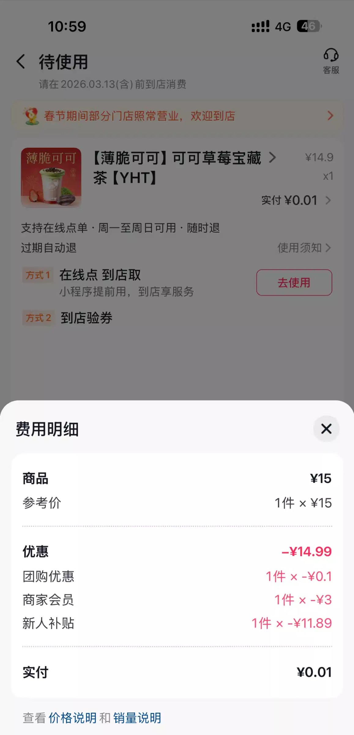 抖音团购 搜索 益禾堂 有新人 入会0.01 买一杯奶茶  没用过一般都有,到店自取