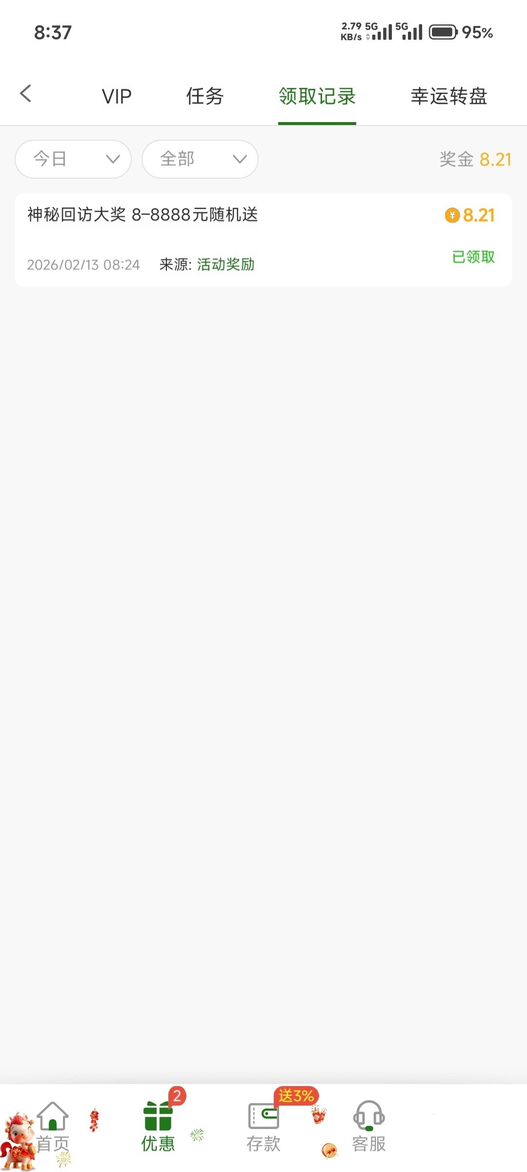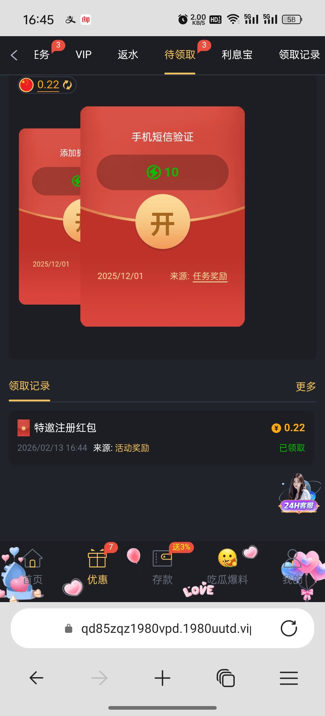 历史存款够一百的,16号可以免费领,领多少随机,看平台。第一天可以免费领取,第二三四天需要充值打流水。后续不充值就只能领取一天。活动去平台看,页面截不了图。