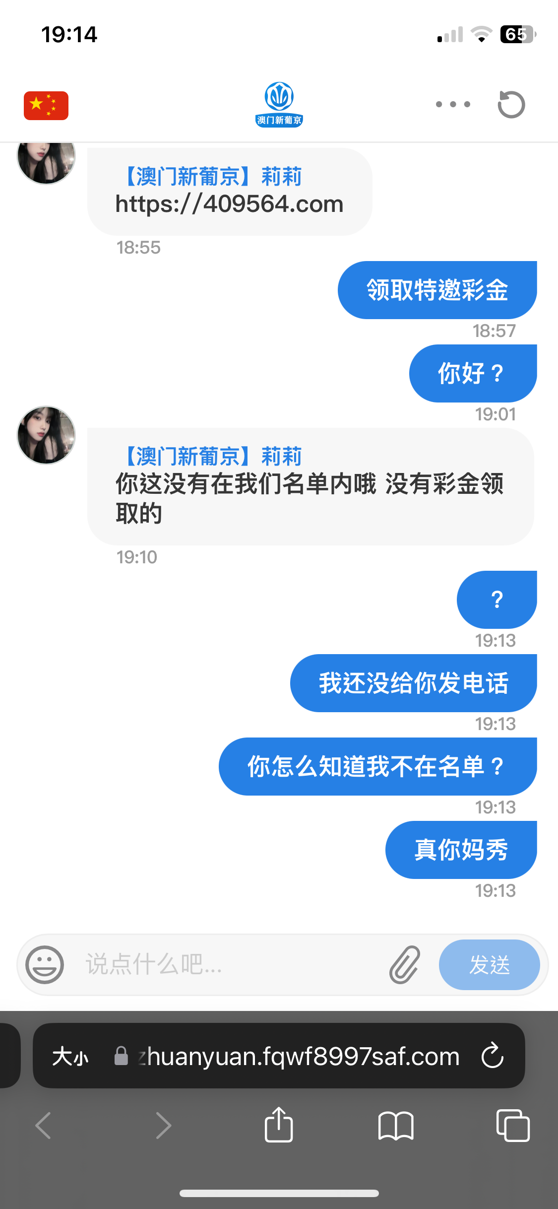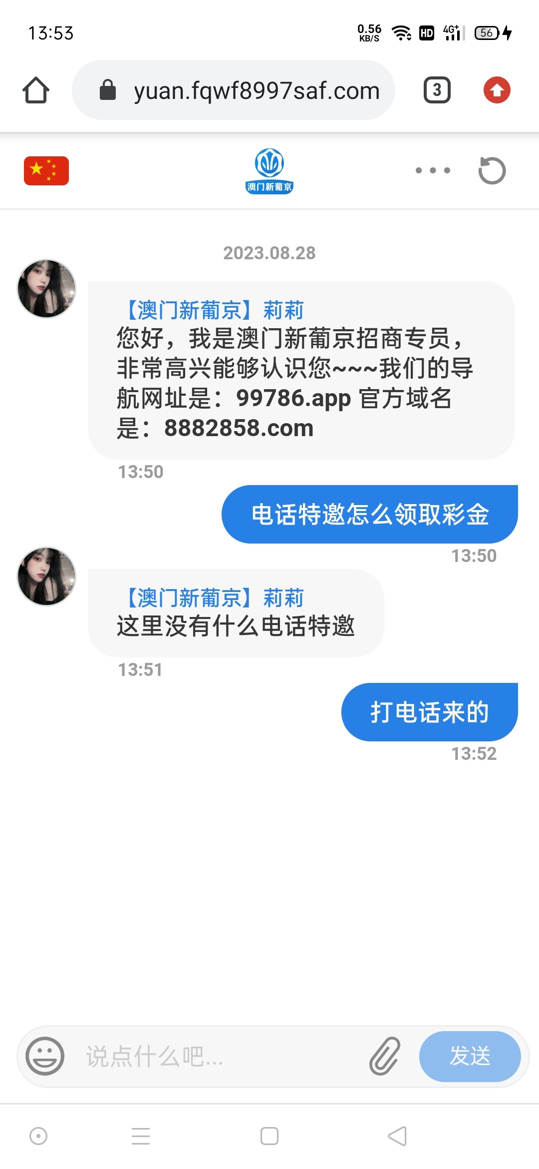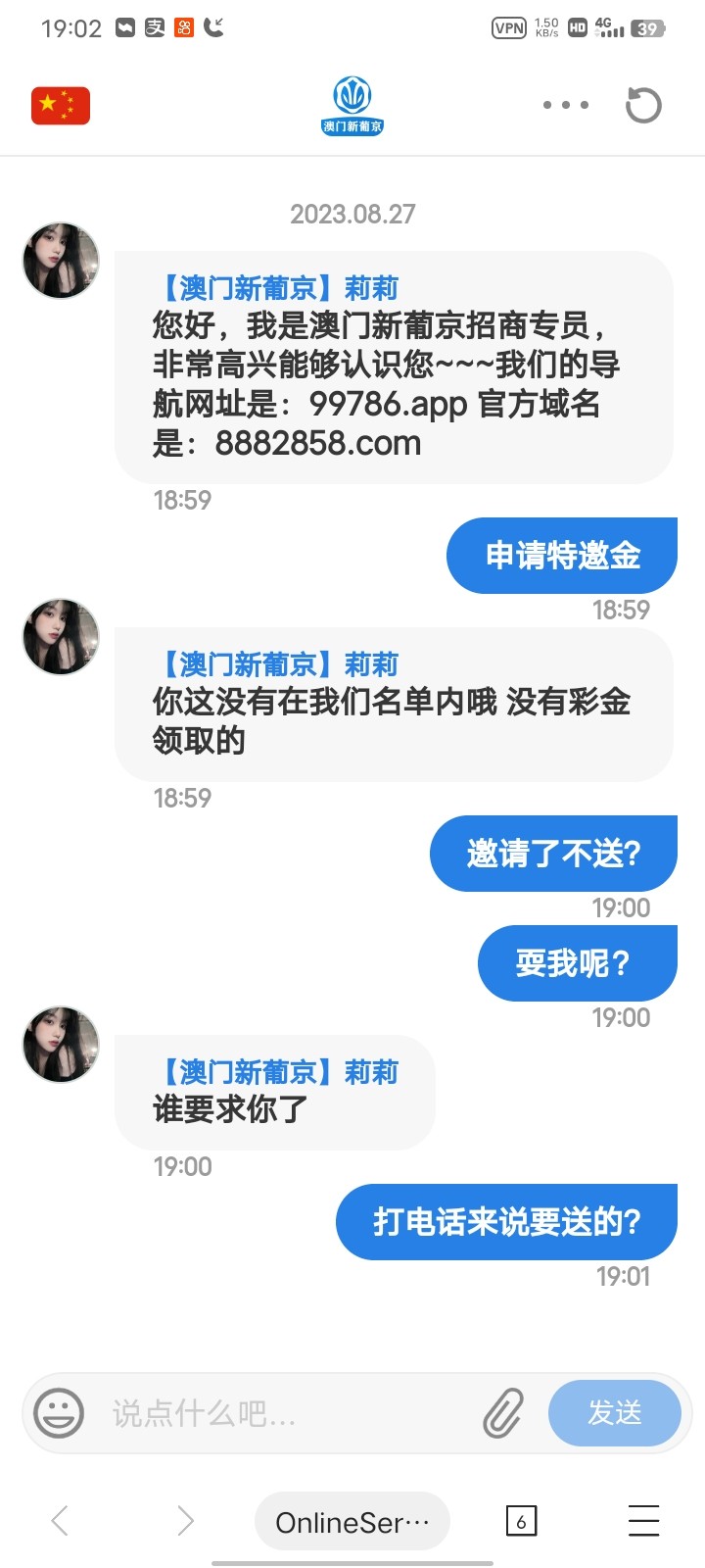下方链接进去找专人领取特邀彩金,会让你发手机号是特邀会给你邀请码注册,碰瓷问就说打电话来的,要图就截图境外电话给他