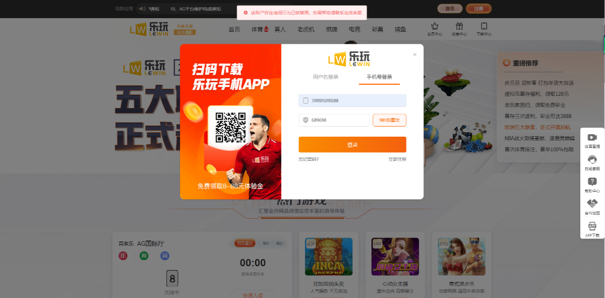 大概是22年国庆时候注册的,平时没怎么上去玩,这几天登上去看到有50红包券,充值100,先用50红包去AG梭哈挂壁,然后100继续梭哈,一顿梭哈最终余额2400,提款审核了2小时后直接封号,问客服说我违规投注,哎。大家自己鉴别吧。以后还是到大台子玩才稳