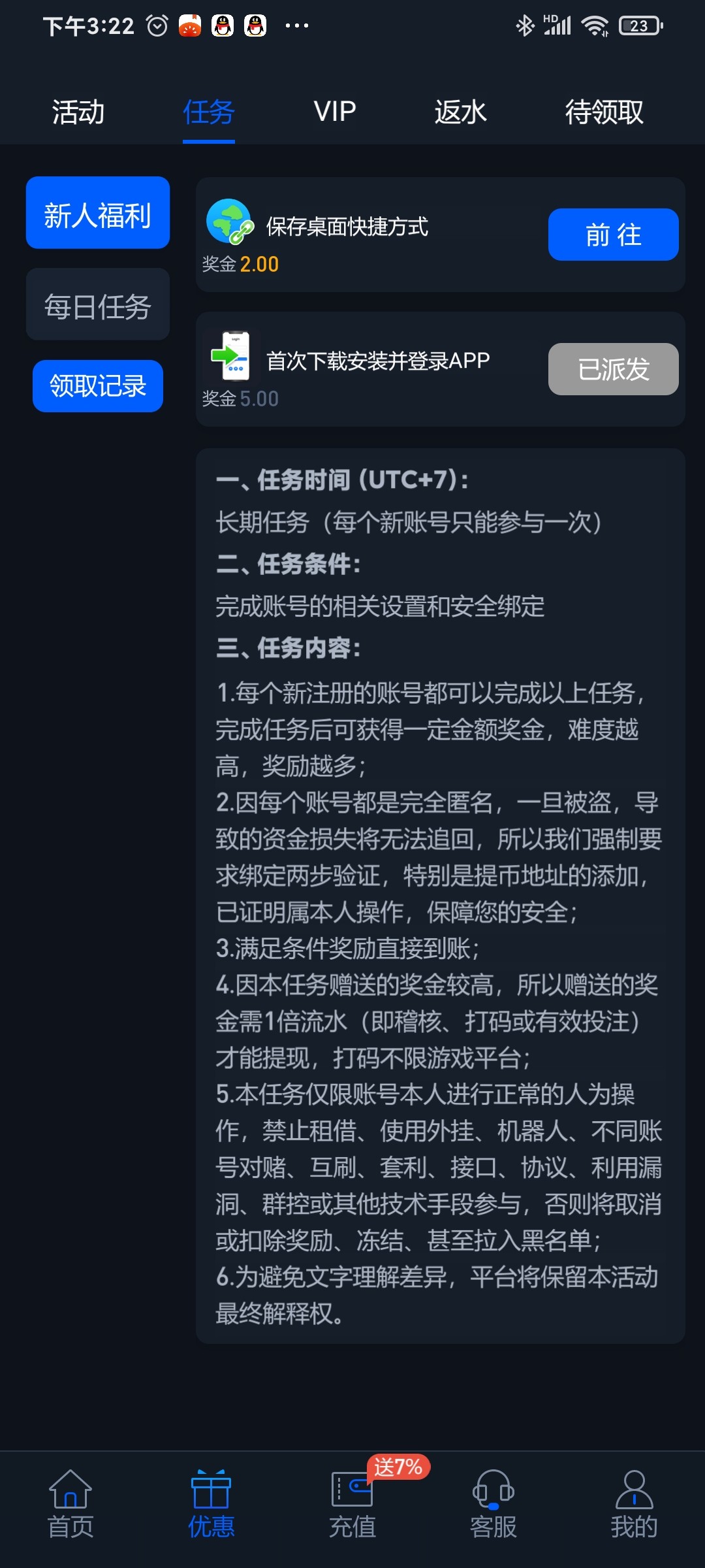 ③申请彩金:实名通过后联系钱包客服提供ab号申请彩金,联系后需要等待十几分钟,目前所有人都到了,没有不到的情况但是不敢保证,反正大概率能到(想下app的自己联系钱包客服要下载链接,好像不下载也没事,截图充值码然后点打开app会打开网页版登陆扫码就好)