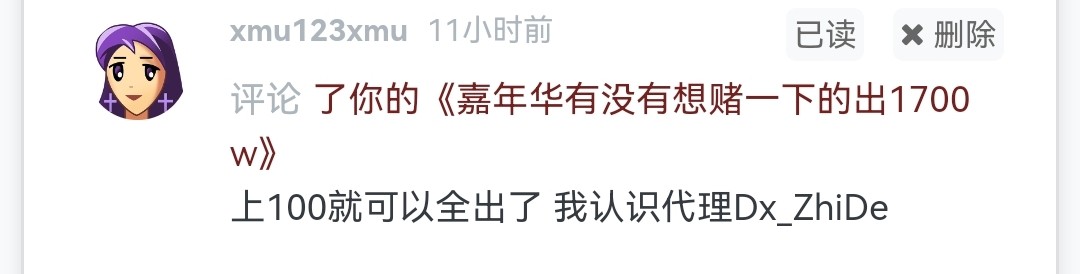 嘉年华下是下成功了,就是遇到了出生傻逼东西。昨天说让你们去赌你们不去我就自己充值玩了下。这个b可能盯上我了。搞了个假代理微信。去了我买他就去代理哪里买,后面下他发了自己收款码跑路了。叫文韬。老哥们以后避雷这个人吧。可能家里全家福他就自拍就够了。