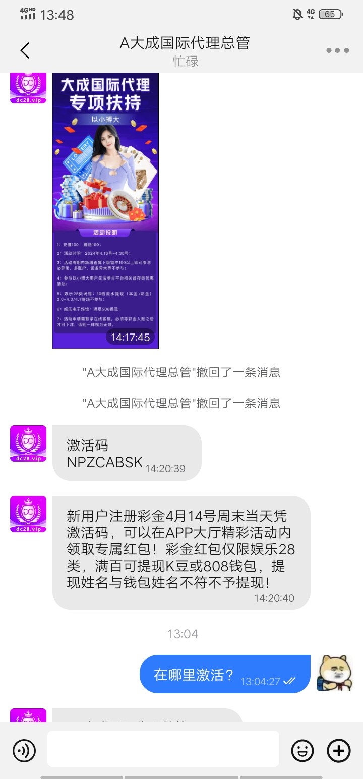我注册送了 提了100到了 用k豆钱包和808钱包 28要打三倍流水  旺旺管理 544717158
