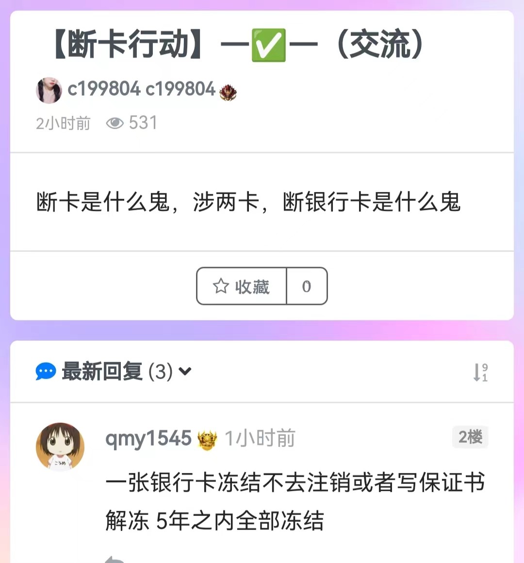 卧槽,这真的假的,一张银行卡被冻,不解冻,其他银行卡也会被冻,老哥们你银行卡被冻了,你去解冻不?我名下有一张不进不出的,三年了,我没管,会不会有事呀!QAQ