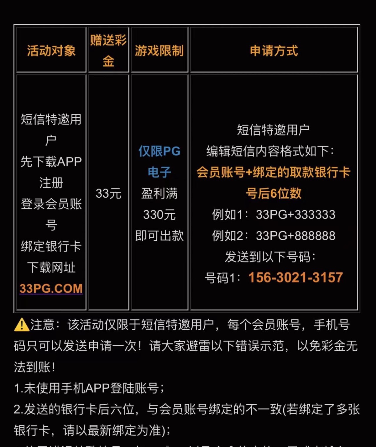 先下载app,再注册绑卡,根据要求发短信秒到33,只能玩pg,330提,注意一定要下载app再注册绑卡,顺序不要错了,具体自测切记勿充值。