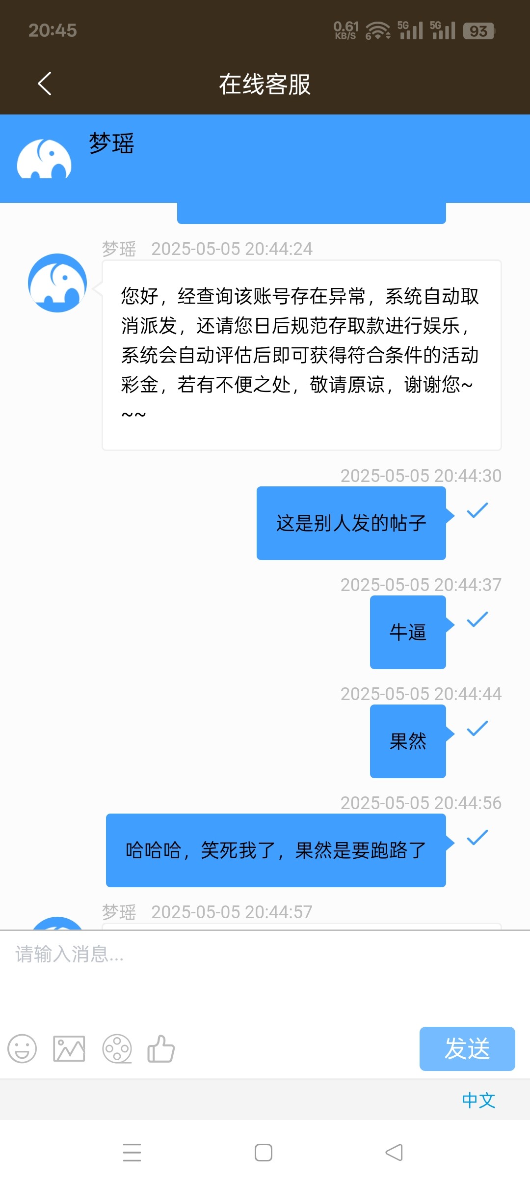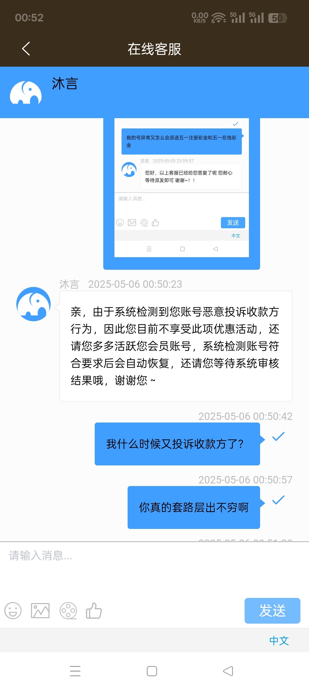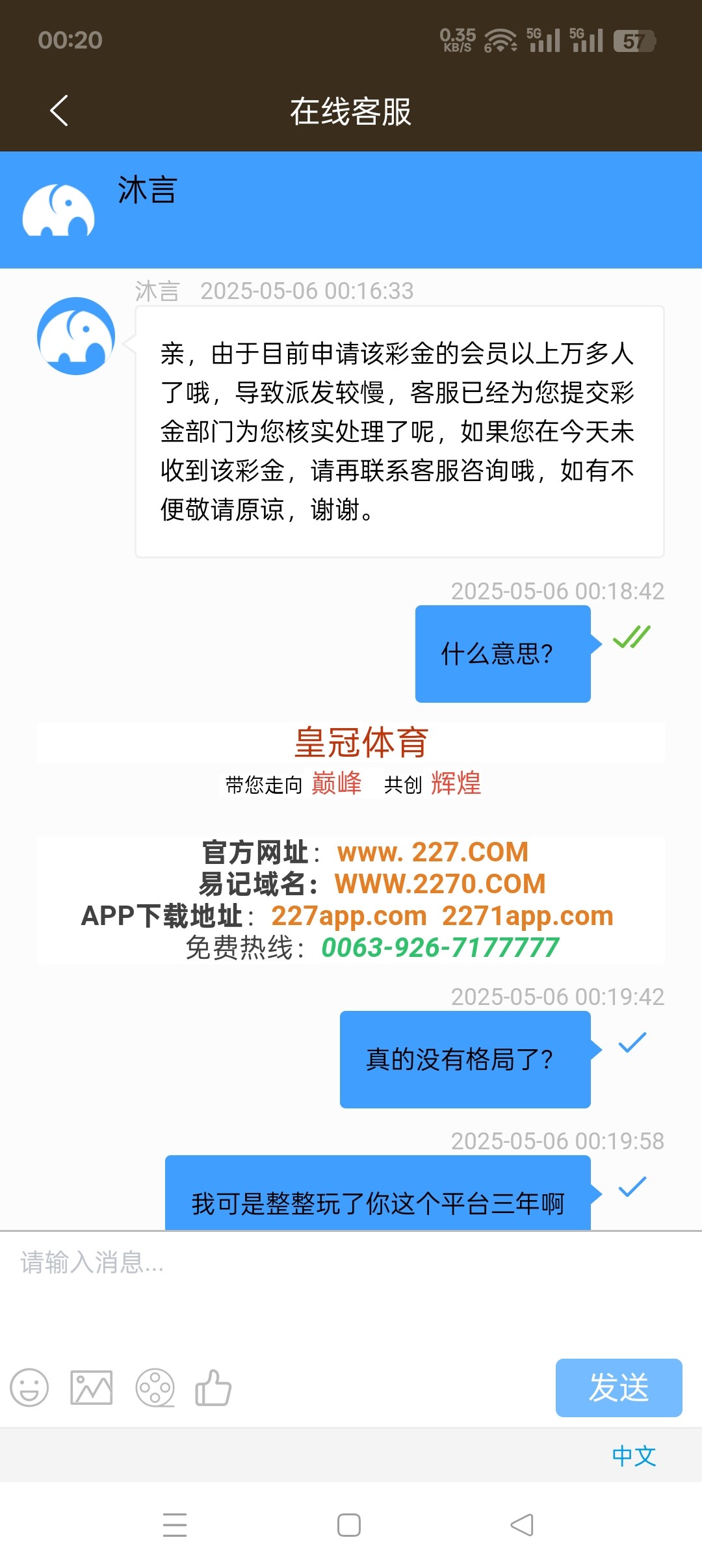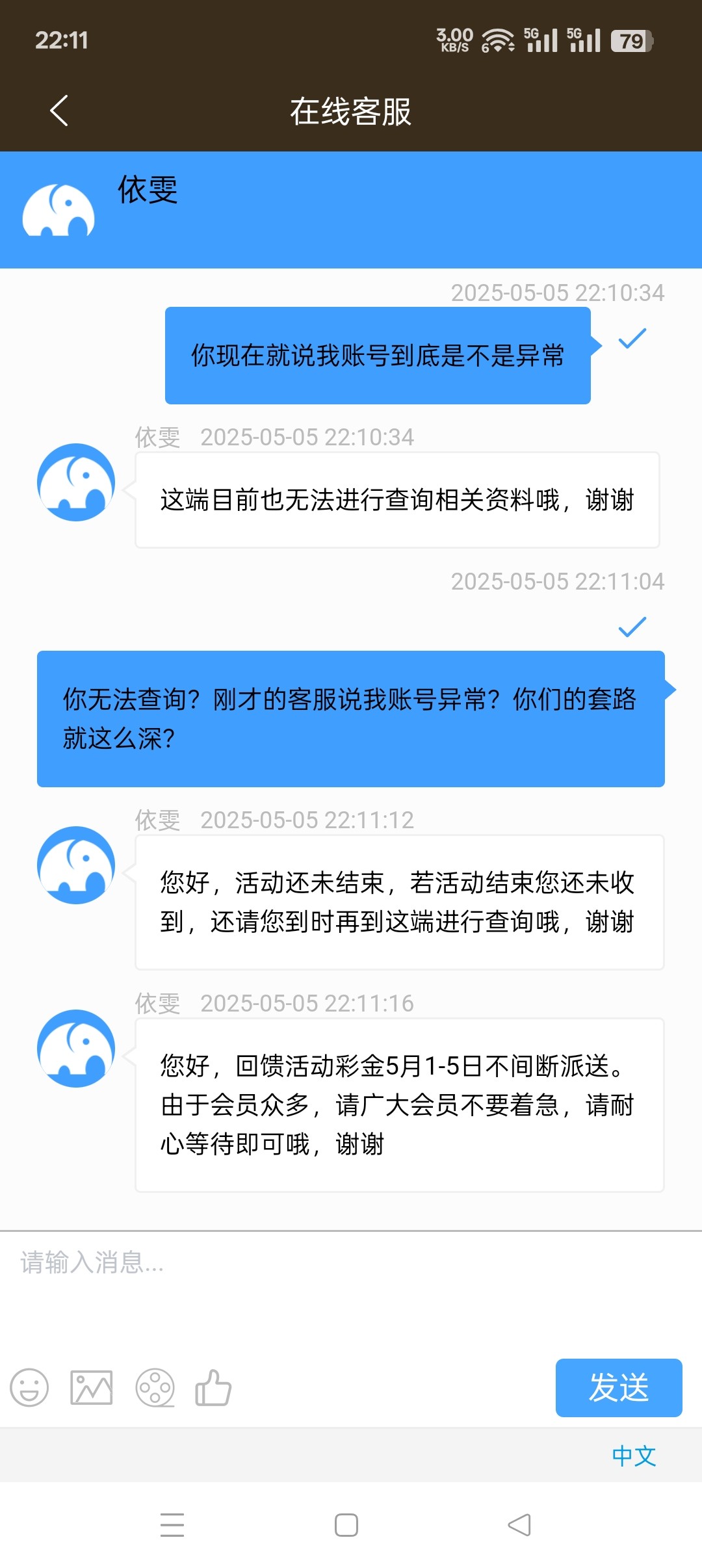 一号就开始说五号之前派送,我今天联系了五个客服,第一个客服说我账号异常,异常送了别的五一彩金?第二个客服说无法查询,那么第一个客服怎么查出的异常?第三个客服说我账号正常符合派送五一历史回馈彩金,第四个客服说符合派送在12点之前没派送再联系客服,第五个客服先说三十分钟内派送,再说一个小时内派送,然后又说今天没派送明天咨询?