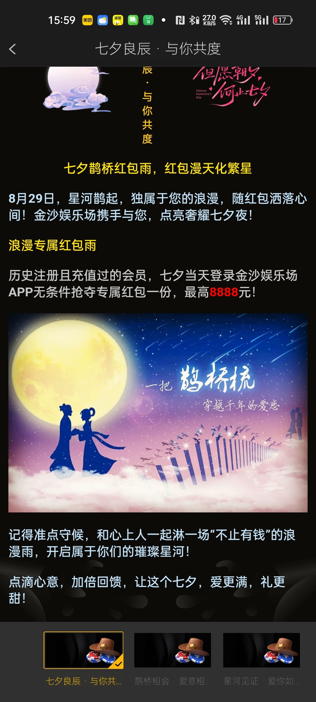 这两个台历史有过充值的凌晨十二点登陆领红包,这两个一般节日红包都还可以,没注册过的可以今天注册冲个十块七夕红包加每日三波小红包肯定不会亏。上次我就是端午活动前充了三十第二天领了100+