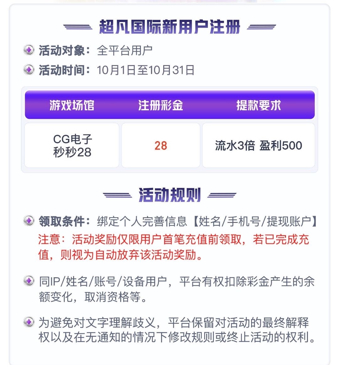 本站声明 1、本帖标题: 【超凡国际】— 注册送28