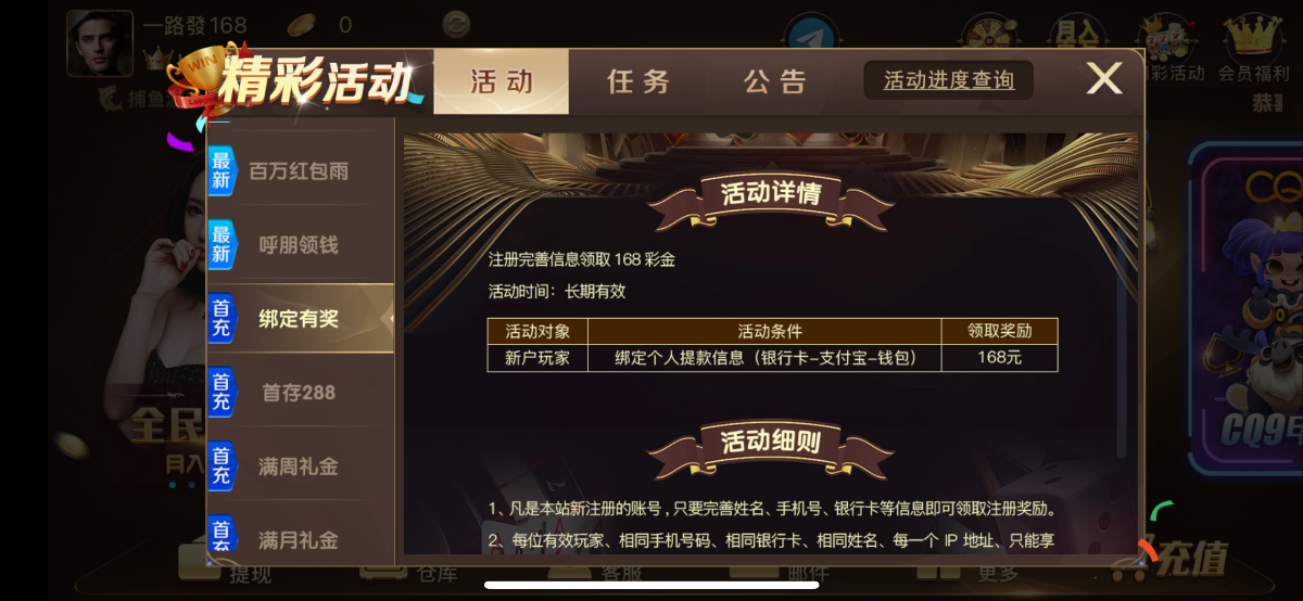 新用户并且注册绑定信息以及提款信息,申请客服、即送最高168元 、送了我12,没打出来、出款自测、105即可提现、无需充值