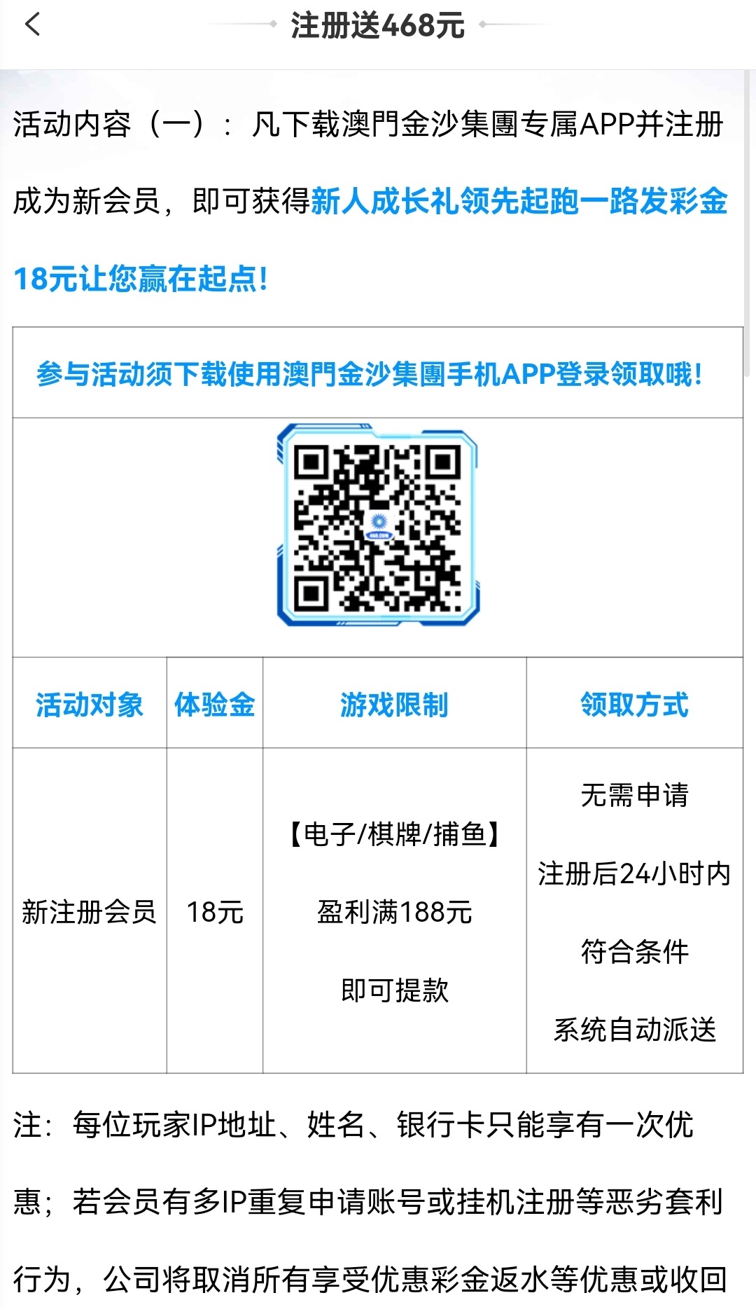 新用户注册下载完善资料一小时内送18,不送无视。限制电子/棋牌/捕鱼,最低188提。