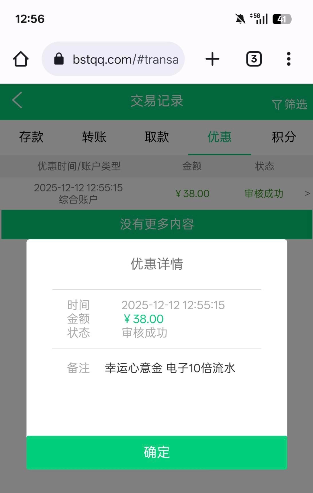 头两天注册的号没充值过中午接电话说送彩金,登录看到送38 10倍流水 bstqq.com