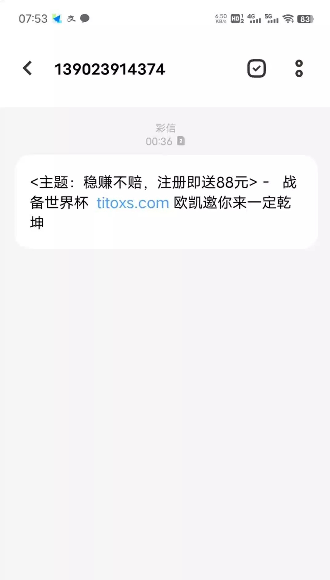 注册送88  注册找客服说领取特邀彩金,88只能打熊猫体育15倍流水,我出了500,开始还以为是黑台,结果提现秒到,应该不需要特邀,我朋友没收到短信注册也送了,必须走短信里面的链接注册才送 http://titoxs.com