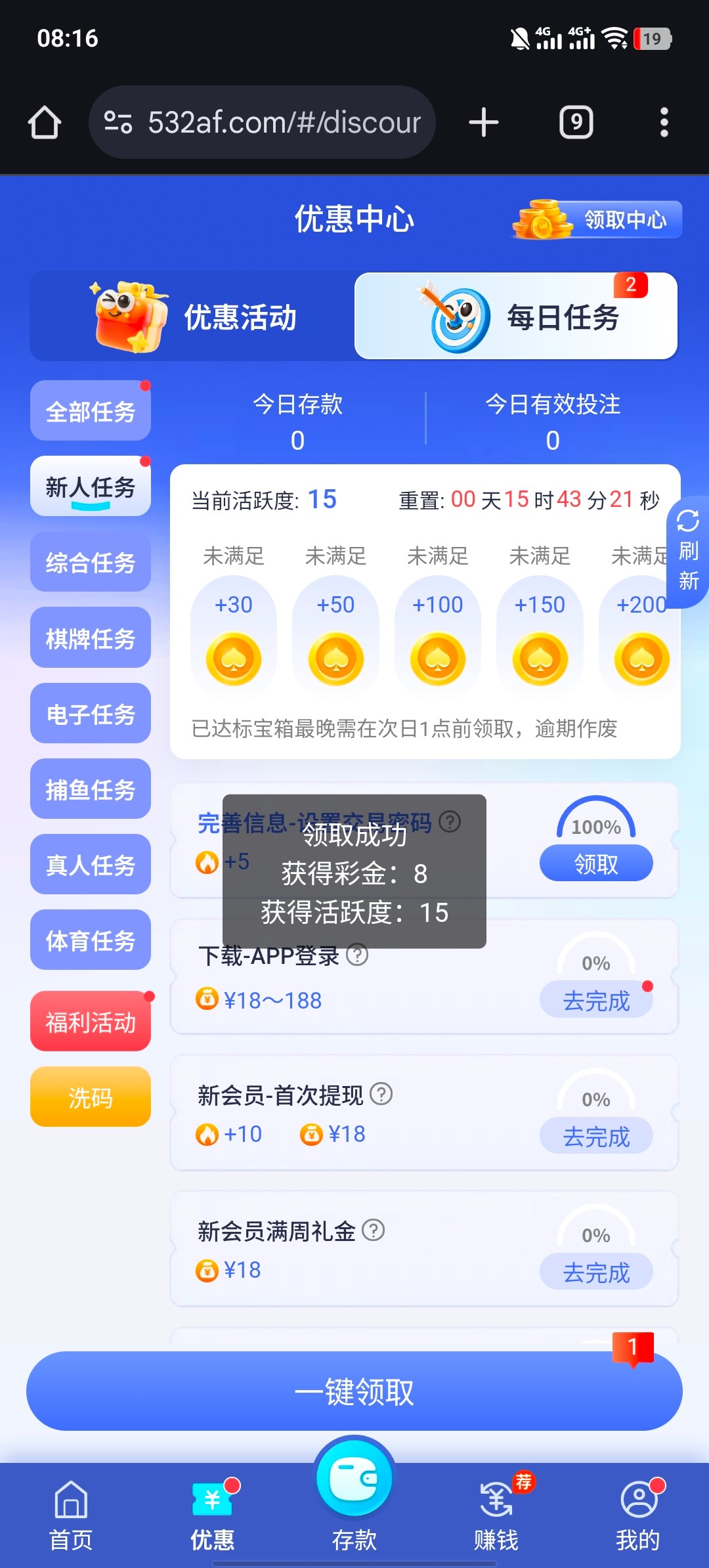 注册账号 完善信息 自助领取8元彩金 彩金盈利满 100提现