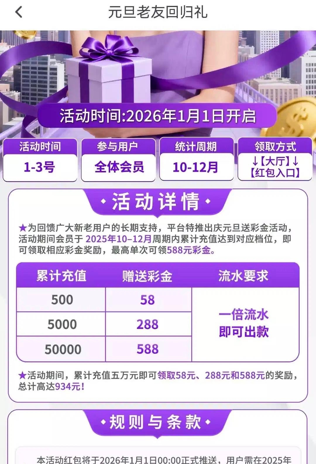 1月1日老友回归礼 10-12月积累充值500以上别错过了 这几个台 热门区或者搜索就出来了