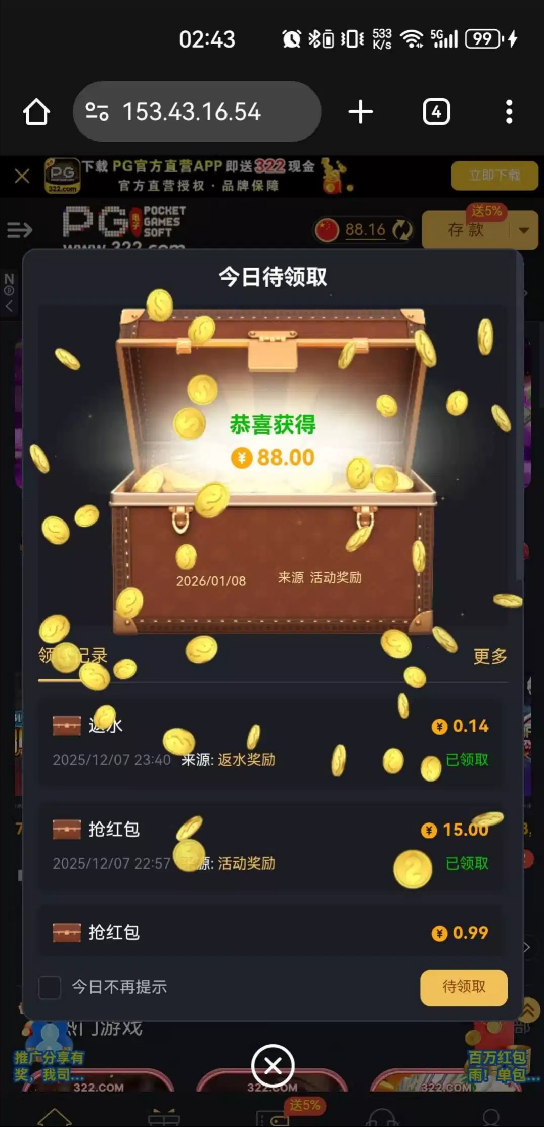 已经大半年没有充值过了,虽然最后没打出来。有号的可以登录看看,送了88幸运彩金链接322.com