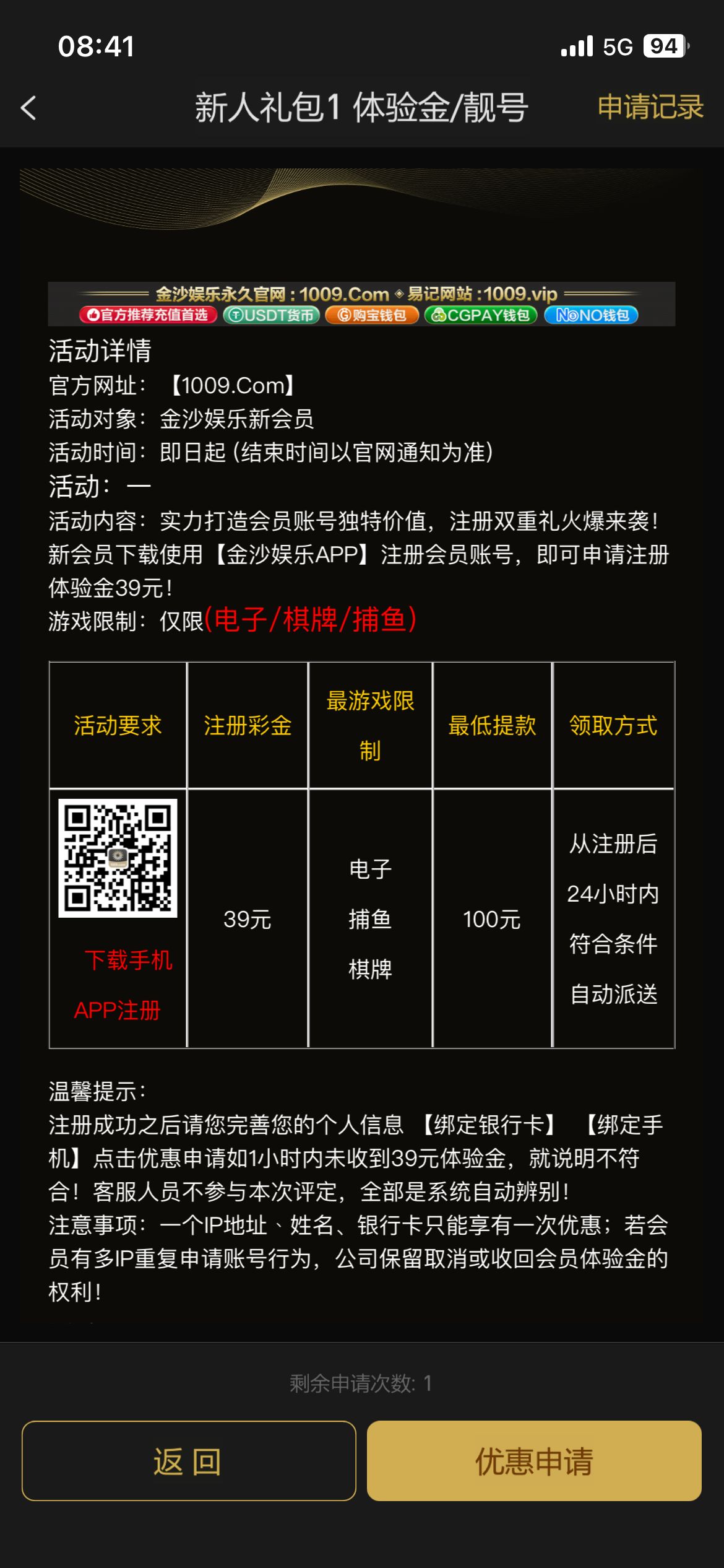 新用户下载注册绑手机号绑卡后,可以去优惠申请39元彩金,我是申请到了,没送无视,记得先下载再注册好像没有游戏限制