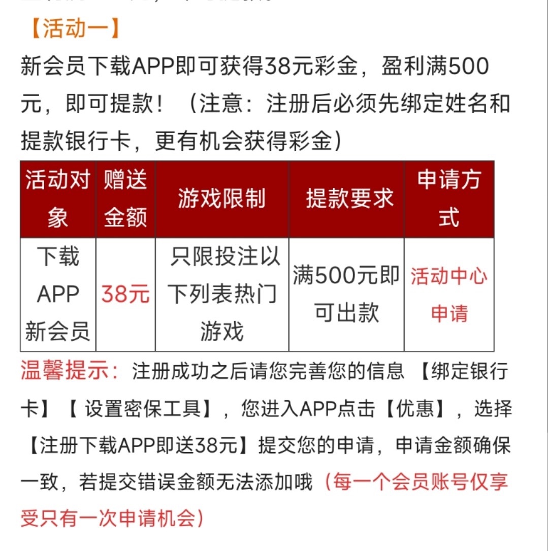 新用户注册绑卡优惠里自助申请送38/500提现,申请不到可以找客服申请试试。