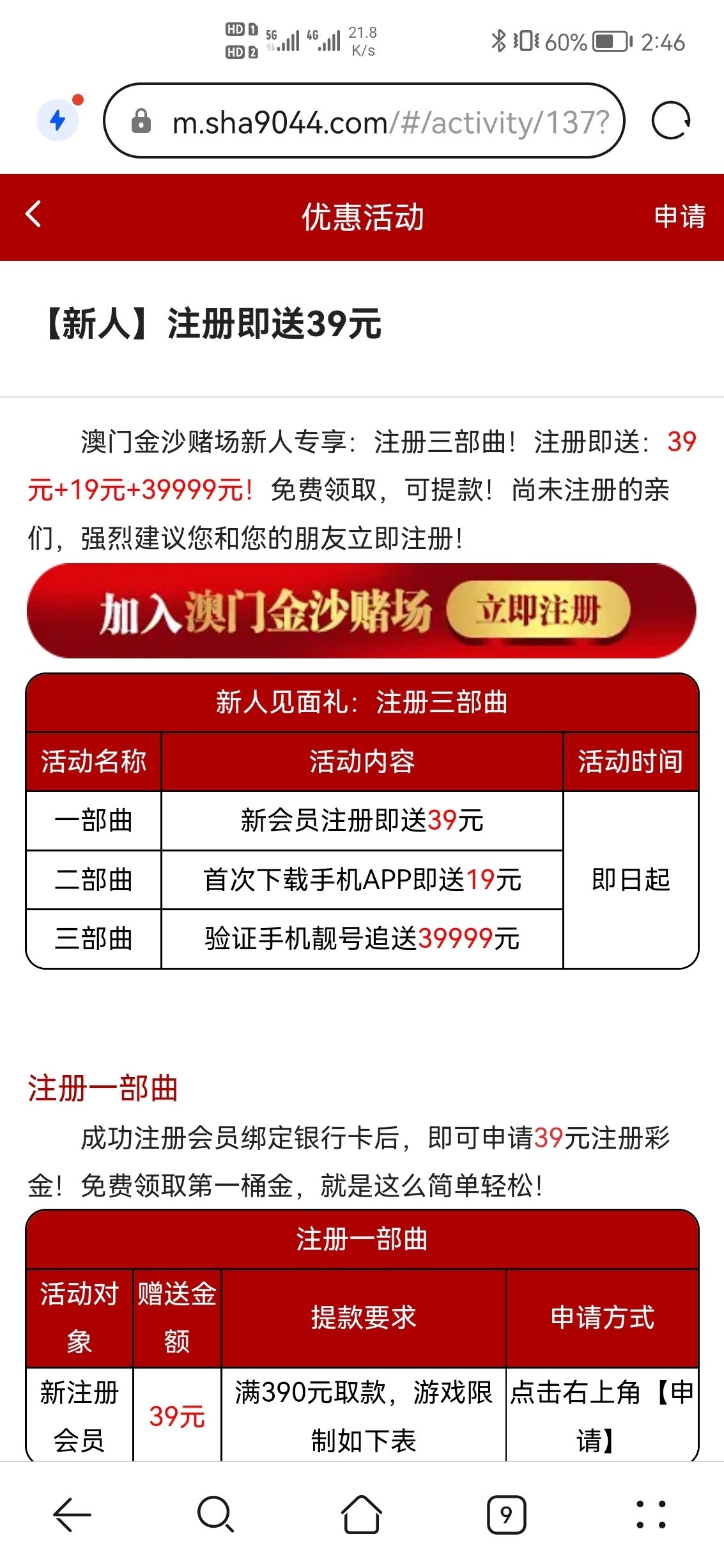 注册完善信息送39,下载APP送19 自助申请,两个的提款限制都不一样,详情看活动规则