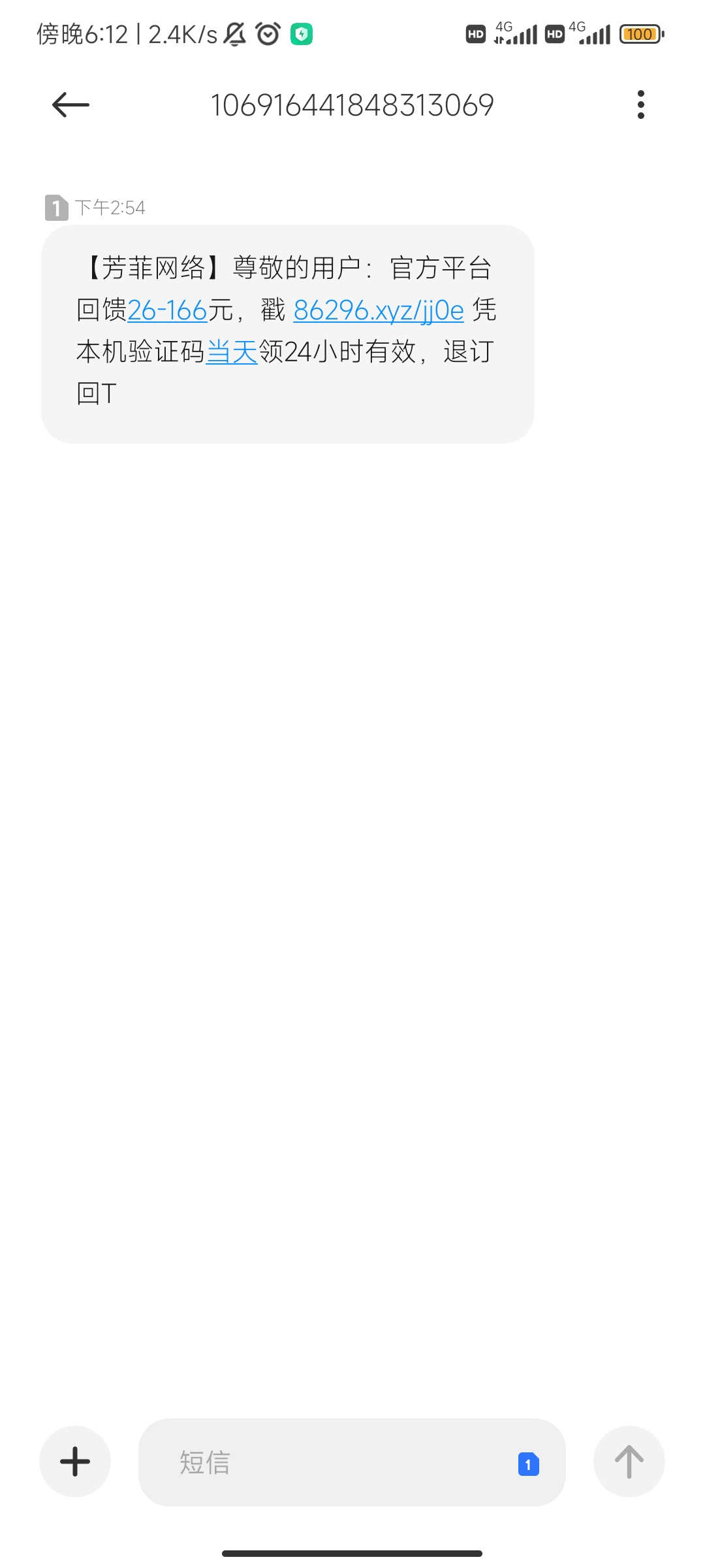 [芳菲网络]尊敬的用户:官方平台回馈26-166元,戳86296.xyz/4nas凭本机验证码当天领24小时有效,退订回T